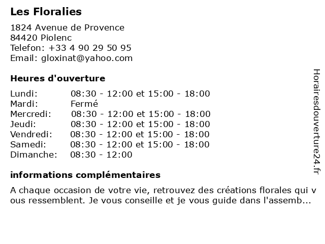 1 Les Floralies de Provence (Distance: 36,28 km) 7 place de la Libération, 26110 Nyons de, fleuristes, fleurs, floralies, jardineries, les, provence, pépinières 2 Multi-accueil "Les Gribouillis" (Distance: 0,34 km) , Avenue Charles de Gaulle, 84420 Piolenc "les, accueil, caregivers houses, child care, family home, gribouillis", home care, kindergartens, micro-nurseries, multi, parental home 4 Multi-accueil "Les Canaillous" (Distance: 6,92 km) , Rue du Moulin, 84830 Sérignan-du-Comtat "les, accueil, canaillous", caregivers houses, child care, family home, home care, kindergartens, micro-nurseries, multi, parental home 5 1001Pharmacies / Pharmacie Cours du Nord (Distance: 9,15 km) 23 Cours du Nord, 84850 Camaret 1001pharmacies, cours, du, la médecine, la pharmacie, la santé, les soins, nord, pharmacie 6 Multi-accueil "Les Bouts de Choux" (Distance: 9,50 km) 11A Rue Marie Curie, 84850 Camaret-sur-Aigues "les, accueil, bouts, caregivers houses, child care, choux", de, family home, home care, kindergartens, micro-nurseries, multi, parental home |