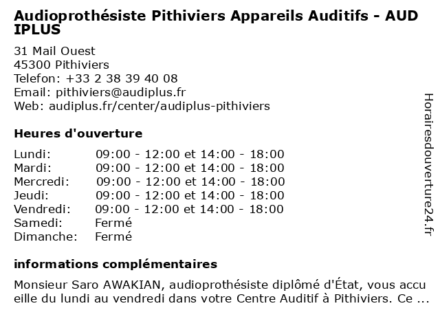 1 Audioprothésiste PITHIVIERS Optical Center (Distance: 1,59 km) 155 Rue Flora Tristan, 45300 Pithiviers audioprothésiste, center, optical, pithiviers 2 But (Distance: 0,69 km) - Avenue Du 8 Mai 1945, 45300 Pithiviers ameublement, appareils, but, magasins, produits, électroménager, électronique 3 Audika (Distance: 30,17 km) 21 Place du Marché, 91490 Milly-la-Forêt appareils auditifs, audika, centre, opticiens et soins, prothèses spécialisées 4 ACUITIS Opticien & Audioprothésiste Saran (Distance: 36,12 km) 2601 Route Nationale 20, 45770 Saran acuitis, audiologiste, audioprothesiste, audioprothésiste, magasin d'appareils auditifs, magasin de lentilles de contact, magasin de lunettes de soleil, opticien, optometrie, saran 5 Entendre (Distance: 40,08 km) 2 Rue Royale, 45000 Orléans aides auditives, appareils auditifs, audioprothésiste, audition, audition difficile, entendre, orleans, orléans, perte d'audition, prothèses auditives, solutions auditives, specialiste audition 6 Centre Audika (Distance: 46,25 km) 1 Rue Victor Hugo, 91290 Arpajon appareils auditifs, audika, centre, opticiens et soins, prothèses spécialisées |