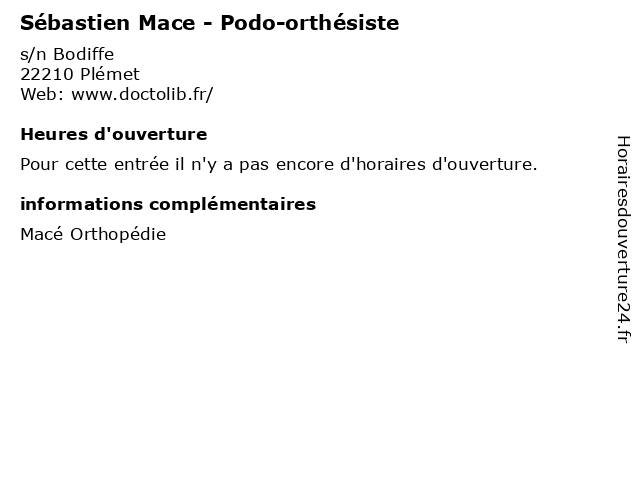 1 Dr Cathline Mace - Médecin interniste (Distance: 6,66 km) - Passage Andre Jouet, 22210 La Chèze cathline, dr, generaliste, interne, interniste, mace, medecin, médecin, soins 3 VÉLO & OXYGEN CYCLES MACE PASCAL FRANCHISÉ INDÉPENDANT (Distance: 12,70 km) 40 Boulevard de la Gare, 22600 Loudéac cycles, franchisé, indépendant, mace, oxygen, pascal, vélo 4 Sébastien Mace - Podo-orthésiste (Distance: 30,40 km) 29 Rue du Général Quinivet, 56300 Pontivy mace, medical, orthopédiste, orthésiste, podo, podologiste, secretariat, sébastien 5 Pauline Mace - Sage-femme (Distance: 37,33 km) 10 rue Marcel Proust, 22000 Saint-Brieuc consultation, docteur, femme, mace, med, médecin, médecine, pauline, sage, traitement 6 Sébastien Mace - Podo-orthésiste (Distance: 44,29 km) 1 Rue Pierre et Marie Curie, 22190 Plérin mace, medical, orthopédiste, orthésiste, podo, podologiste, secretariat, sébastien |