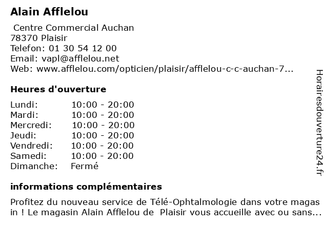 1 Alain Afflelou (Distance: 10,74 km) . Route Nationale 13, 78240 Chambourcy afflelou, alain, lentilles, lunettes, opticien, optique 2 Alain Afflelou (Distance: 11,66 km) Centre Commercial Les Grandes Terres, 78160 Marly-Le-Roi afflelou, alain, magasin de lunettes de soleil, magasin d’accessoires de mode, optométrie 3 Alain Afflelou (Distance: 12,26 km) Centre Commercial Parly 2, 78150 Le Chesnay afflelou, alain, magasin de lunettes de soleil, magasin d’accessoires de mode, optométrie 4 Alain Afflelou (Distance: 16,30 km) Alain Afflelou Ccal Le Grand Cedre, 78260 Acheres afflelou, alain, divers, détail, magasins, nra, optic, sjfs 5 Alain Afflelou (Distance: 16,92 km) 67 Centre Commercial, 78410 Flins accessoires, afflelou, alain, beaute&sante, cafe, chaussures, enfants, mode femmes, mode hommes, optique, restaurant, service, sport 6 Alain Afflelou (Distance: 18,62 km) 67 Boulevard de la République, 92210 Saint Cloud afflelou, aide auditive, alain, appareil auditif, opticien, prothèses auditive |
