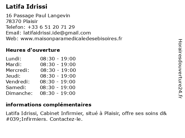 1 Laila Idrissi - Hypnothérapeute (Distance: 11,01 km) 35 Rue aux Fleurs, 78960 Voisins-le-Bretonneux hypnose, hypnotherapeute, hypnothérapeute, idrissi, laila, sante, soins 3 Dr Younes Chekkoury Idrissi - Oto-rhino-laryngologie (Distance: 20,28 km) 40 Rue Worth, 92150 Suresnes chekkoury, dr, idrissi, laryngologie, médecins, médicaments, oto, rhino, santé, secrétariat, spécialiste, younes 4 Bouzidi-Idrissi Amine (Distance: 25,75 km) 2 Rue De La Station, 92600 Asnieres Sur Seine amine, bouzidi, idrissi, restaurants 5 El Houari El Idrissi Maryam (Distance: 27,48 km) 32 Rue Jean Jaures, 92230 Gennevilliers houari, idrissi, maryam, restaurants 6 Dr Linda Hajouji-Idrissi - Pneumologue (Distance: 27,74 km) 3 Rue de la Paix, 92230 Gennevilliers consultation, docteur, dr, hajouji, idrissi, linda, med, médecin, médecine, pneumologue, traitement |