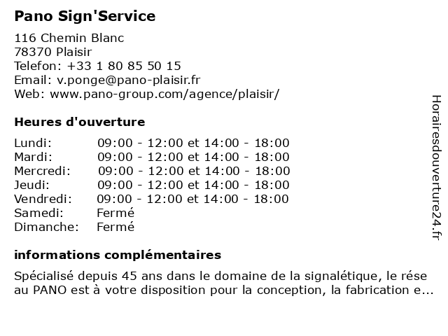 1 Pano (Distance: 0,40 km) 116 chemin Blanc, 78370 Plaisir boutique, communication, entreprise, pano, publicité, signalétique 2 Pano (Distance: 7,67 km) 189 route nationale 10, 78310 Coignières décoration vitrine, enseigne, impression numérique, lettres adhésives, marquage, pano, signalétique 4 Pano Sign'Service (Distance: 23,85 km) 89 avenue Marceau, 92400 Courbevoie agence, pano, publicitaire, sign'service 5 Dr Andrew Ng Sign Kwong - Chirurgien-dentiste (Distance: 29,82 km) 188 Avenue d'Italie, 75013 Paris andrew, chirurgien, dent, dentiste, docteur, dr, kwong, ng, sign, soins 6 Pano Sign'service (Distance: 30,18 km) 21 Boulevard du Maréchal Foch, 95210 Saint-Gratien pano, sign'service |