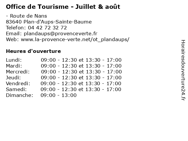 1 Office de Tourisme - Hors saison (Distance: 0,00 km) - Route de Nans, 83640 Plan-d'Aups-Sainte-Baume de, horaires des musées, hors, office, restaurants, saison, tourisme, transports 2 Office de Tourisme - Avril / Mai / Juin / Septembre (Distance: 0,00 km) - Route de Nans, 83640 Plan-d'Aups-Sainte-Baume avril, de, horaires des musées, juin, mai, office, restaurants, septembre, tourisme, transports 3 Bibliothèque Municipale - Juillet et Août (Distance: 5,29 km) . Place Gabriel Vialle, 13780 Cuges-les-Pins août, bibliothèque, cd audio, cd.rom, et, horaires, juillet, livres, municipale, revues 4 Office du Tourisme et de la Culture (Distance: 5,96 km) Boulevard de la Libération, 83640 Saint-Zacharie culture, de, du, et, la, office, tourisme 5 Office de Tourisme Intercommunal du Pays d'Aubagne et de l'Etoile (Distance: 15,04 km) 8 Cours Barthélémy, 13400 Aubagne d'aubagne, de, du, et, intercommunal, l'etoile, office, pays, tourisme, tours, travel agency 6 Aqualand - du 16 juin au 8 juillet et du 27 Août au 9 Septembre (Distance: 17,41 km) - ZAC des Pradeaux, 83270 St Cyr Sur Mer 16, 27, août, aqualand, aquatique, au, centre, du, et, juillet, juin, loisirs, septembre |
