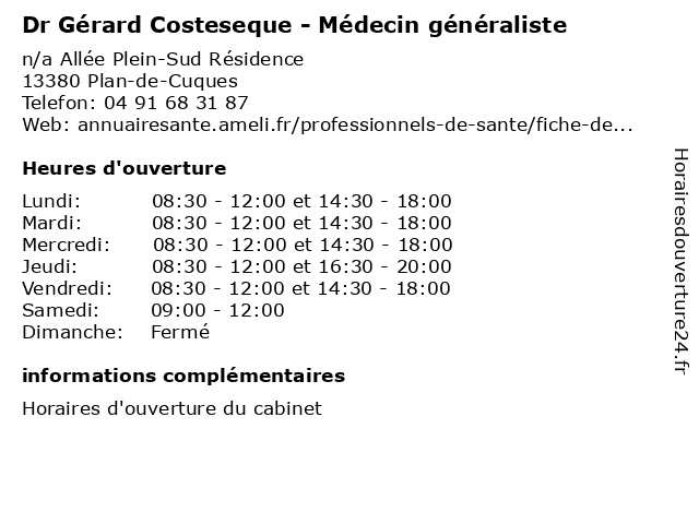 | Lundi | 08:30-12:00 et 14:30-18:00 |