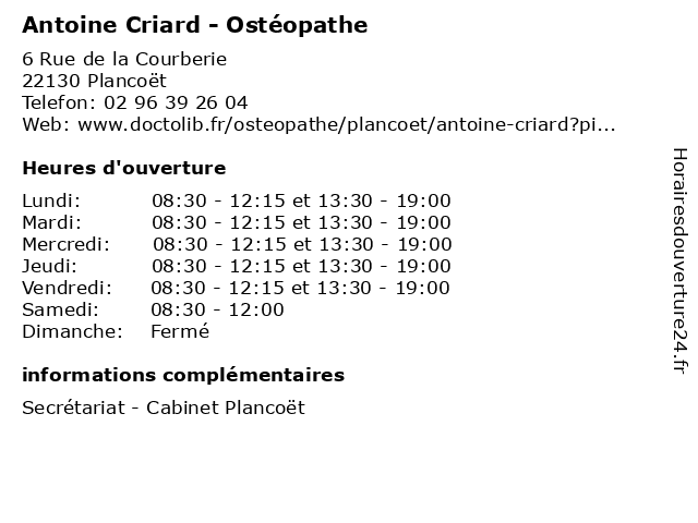 | Mercredi | 08:30-12:15 et 13:30-19:00 |