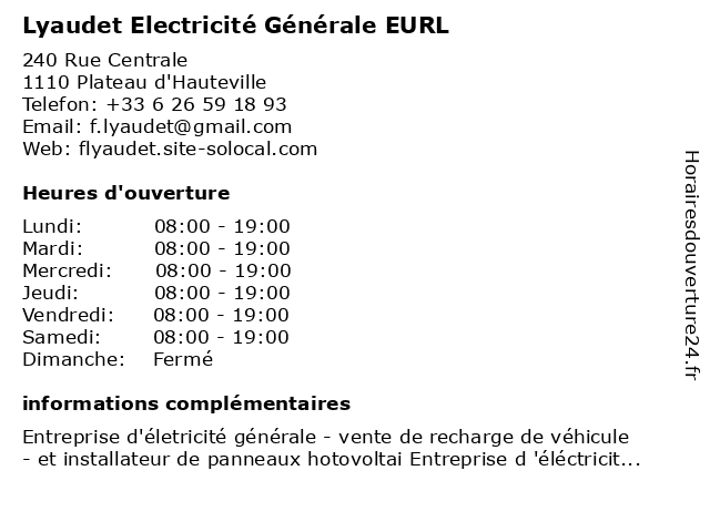 1 Lyaudet Electricité Générale EURL (Distance: 0,00 km) 240 Rue Centrale, 01110 Plateau d'Hauteville electricité, eurl, générale, lyaudet 2 Lyaudet Electricité Générale EURL (Distance: 4,15 km) 307 Route du Chalet, 01110 Plateau d'Hauteville electricité, eurl, générale, lyaudet 3 Cabinet médical Beau Site 2 - Médecine générale (secrétariat ) (Distance: 0,90 km) 208 Rue Jean Miguet, 01110 Hauteville Lompnes beau, cabinet, consultation, docteur, générale, médecine, médical, santé, secrétariat, site 4 Lemaitre Electricité (Distance: 1,68 km) 130 Lotissement les Abérreaux, 01110 Plateau d'Hauteville electricité, lemaitre 5 SCIERIE LYAUDET SAS (Distance: 3,46 km) 153 Rue de la Scierie, 01110 Plateau d'Hauteville lyaudet, sas, scierie 6 OHMS Services Electricité (Distance: 10,04 km) 4 En Courtioux, 01230 Tenay electricité, ohms, services, tenay, électricité |