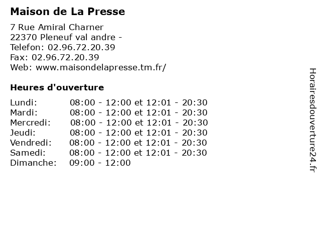 2 Maison de La Presse (Distance: 19,21 km) 5 Place Croix Au Beurre -, 22550 Matignon cadeaux, carterie, confiserie-boissons-food, de, française des jeux, la, librairie, maison, papeterie, pmu, presse, tabac 3 Mag Presse (Distance: 1,56 km) . Rue de Saint-Alban, 22370 Pléneuf Val André mag, magazine, presse, services 5 Mag Presse (Distance: 16,12 km) 6 Place De La Cite, 22000 Saint Brieuc mag, magazine, presse, services 6 |