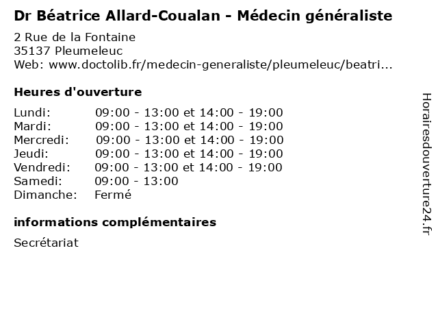 | Lundi | 09:00-13:00 et 14:00-19:00 |