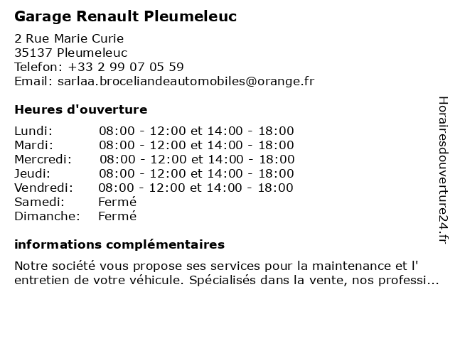 2 Garage Gilles Gandon - Renault (Distance: 4,65 km) - Za des Tardivières, 35160 Montfort-sur-Meu atelier, automobile, automobiles, concessionnaire, entretien, gandon, garage, gilles, renault, réparation, vente 3 Renault Garage Gourdet Agent (Distance: 8,12 km) Rue de Rennes, 35590 Saint-Gilles agent, garage, gourdet, renault 4 Garage Morlais - Renault (Distance: 9,80 km) 21 rue de Mordelles, 35590 L'Hermitage atelier, automobile, concessionnaire, entretien, garage, morlais, renault, réparation, vente 5 Garage Choquet - Renault /Dacia (Distance: 12,46 km) 65 Rue de la Libération, 35310 Mordelles /dacia, choquet, garage, renault 6 Pacé Automobiles - Renault (Distance: 12,64 km) 1 boulevard du Scorff, 35740 Pacé atelier, automobile, automobiles, concessionnaire, entretien, garage, pacé, renault, réparation, vente |