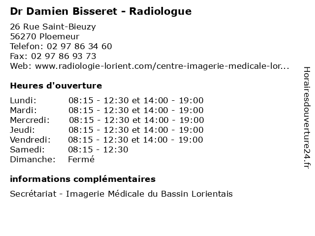 1 Dr Damien Bisseret - Radiologue (Distance: 6,83 km) 44 avenue Francois Billoux, 56600 Lanester bisseret, consultation, damien, docteur, dr, med, médecin, médecine, radiologue, traitement 2 Dr Damien Bisseret - Radiologue (Distance: 14,52 km) 11 Avenue Salvador Allende, 56700 Hennebont bisseret, consultation, damien, docteur, dr, med, médecin, médecine, radiologue, traitement 3 Dr Damien Bisseret - Radiologue (Distance: 18,45 km) 1 Avenue du Lezardeau, 29300 Quimperlé bisseret, consultation, damien, docteur, dr, med, médecin, médecine, radiologue, traitement 4 Maître Damien Guillou - Avocat (Distance: 5,09 km) 3 Boulevard du Général Leclerc, 56100 Lorient avocat, damien, guillou, justice, lois, maitre, maître 5 Dr Damien Lozachmeur - Anesthésiste (Distance: 5,70 km) 5 avenue de Choiseul, 56100 Lorient anesthésiste, consultation, damien, docteur, dr, lozachmeur, med, médecin, médecine, traitement 6 Dr Damien Henry - Médecin généraliste (Distance: 5,70 km) 5 avenue de Choiseul, 56100 Lorient consultation, damien, docteur, dr, généraliste, henry, med, medecine, medical, médecin, traitement |