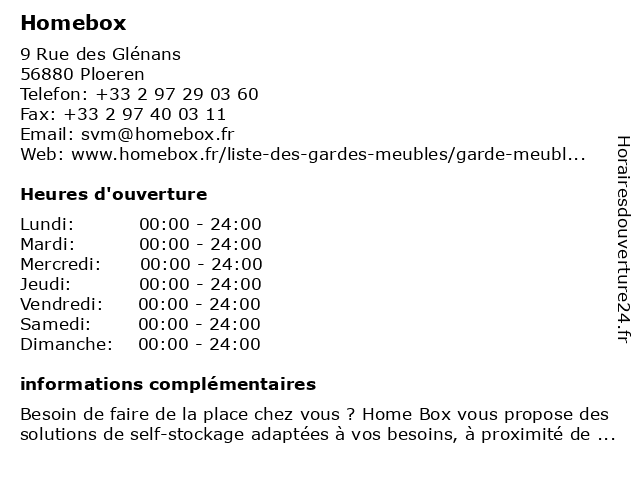 1 Homebox (Distance: 0,02 km) 9 rue des Glénans, 56880 Ploeren affaire, agence, boxes, garde meubles, homebox, location 2 Homebox (Distance: 8,51 km) - Allée Nicolas Appert, 56000 Vannes affaire, agence, boxes, garde meubles, homebox, location 4 Homebox SVM Franchisé indépendant (Distance: 13,32 km) Impasse de la Lande, 56400 Brech franchisé, homebox, indépendant, svm 6 |