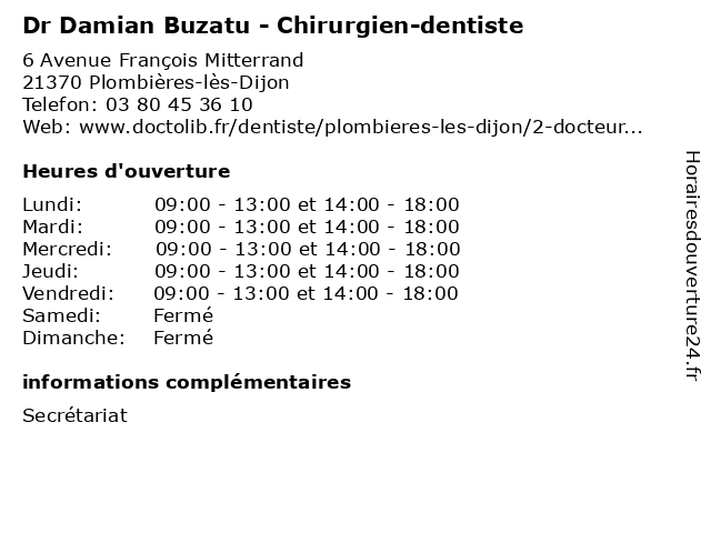 | Lundi | 09:00-13:00 et 14:00-18:00 |