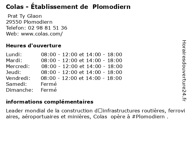 2 Colas Centre-Ouest (Distance: 20,57 km) 4 Rue Rontgen, 29000 Quimper centre, colas, colas centre ouest, colas quimper, enrobé, enrobé quimper, ouest, travaux, travaux quimper 3 Colas - Établissement de Quimper (Distance: 20,64 km) Rue Rontgen, 29000 Quimper colas, de, entreprise générale de construction, quimper, établissement 4 Colas - Établissement de Brest / Valormat (Distance: 23,46 km) Lieu-dit Keramborn, 29460 Dirinon brest, centre de recyclage, colas, de, entreprise générale de construction, valormat, établissement 5 Colas - Établissement de Brest (Distance: 24,77 km) 1 Rue Du Général Leclerc, 29470 Plougastel Daoulas brest, centre de recyclage, colas, de, entreprise générale de construction, établissement 6 Colas (Distance: 24,80 km) 1 Rue du Général Leclerc, 29470 Plougastel-Daoulas colas, conception, construction, entretien, public, réalisation, travaux |