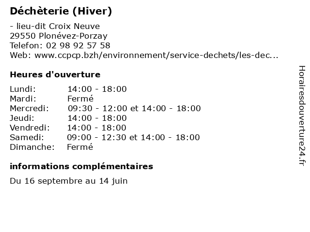 1 Déchèterie (Hiver) (Distance: 11,93 km) - lieu-dit Kerdrein, 29180 Guengat bennes, débarras, déchets, déchèterie, hiver, ordures 2 Déchèterie (Hiver) (Distance: 15,89 km) - lieu-dit Kerguelen, 29590 Rosnoën bennes, débarras, déchets, déchèterie, hiver, ordures 3 Déchèterie (Hiver) (Distance: 19,41 km) - ZA de Kerdanvez, 29160 Crozon bennes, débarras, déchets, déchèterie, hiver, ordures 4 Déchèterie (Été) (Distance: 0,00 km) - lieu-dit Croix Neuve, 29550 Plonévez-Porzay bennes, débarras, déchets, déchèterie, ordures, été 5 Déchèterie (Distance: 7,58 km) - Parc d’activités de Lannugat Nord, 29100 Douarnenez bennes, débarras, déchets, déchèterie, ordures 6 Déchèterie (Distance: 12,77 km) - Route de Douarnenez, 29100 Poullan-sur-Mer bennes, débarras, déchets, déchèterie, ordures |