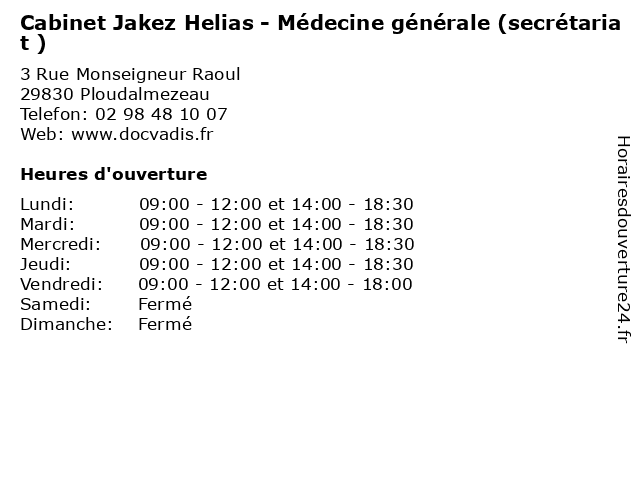 Termes de recherche pour Cabinet Jakez Helias - Médecine générale (secrétariat ):cabinet, générale, medecine, santé, secretariat, docteur, consultation, helias, jakez |