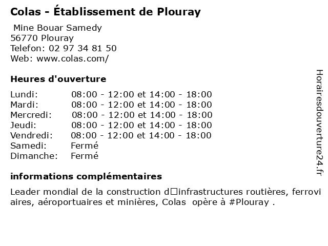 1 Colas (Distance: 0,16 km) Mine Bouar, 56770 Plouray colas, conception, construction, entretien, public, réalisation, travaux 2 Colas - Établissement de Quimperlé (Distance: 35,46 km) 14 Rue Jacqueline Auriol, 29300 Quimperle colas, de, entreprise générale de construction, quimperlé, établissement 3 Boulangerie Colas (Distance: 41,63 km) 5 place de l'Eglise, 29350 Moelan Sur Mer boulangerie, colas, restaurants, snacks, viennoiseries 5 Colas (Distance: 51,16 km) ZA des Parpareux, 22600 Loudéac colas, conception, construction, entretien, public, réalisation, travaux 6 Colas - Établissement de Loudeac (Distance: 51,32 km) Za Les Parpareux, 22600 Loudeac colas, de, entreprise générale de construction, loudeac, établissement |