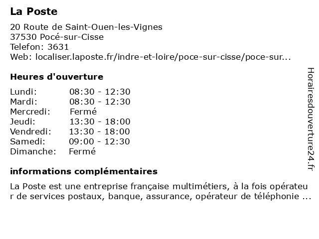 1 La Poste (Distance: 2,62 km) - Boulevard Gambetta, 37400 Amboise express chronopost, la, poste, réexpédition internationale 2 La Poste (Distance: 2,83 km) 6 Place de l'Eglise, 37530 Limeray express chronopost, la, poste, réexpédition internationale 3 La Poste (Distance: 2,83 km) 8 Rue Jules Gautier, 37530 Saint-Ouen-les-Vignes express chronopost, la, poste, réexpédition internationale 4 La Poste (Distance: 3,08 km) 10 Rue Camille Breton, 37530 Nazelles-Négron express chronopost, la, poste, réexpédition internationale 5 La Poste (Distance: 3,22 km) - Rue du Général de Gaulle, 37530 Charge agence postale, courrier postal, expédition internationale, la, poste 6 La Poste (Distance: 5,21 km) 1 Route de Châteaurenault, 37530 Cangey express chronopost, la, poste, réexpédition internationale |