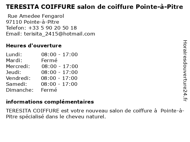 1 Le Salon de la Musique. (Distance: 0,66 km) 26 Rue Achille René Boisneuf, 97110 Pointe-à-Pitre de, la, le, musique., salon 2 ANAFAGC Pointre à pitre (Distance: 0,30 km) 16 rue François Arago, 97110 Pointe à pitre anafagc, pitre, pointre 3 Glamour et Chic (Distance: 3,38 km) 4-5 Résidence bas du fort, 97190 Le Gosier chic, coiffeur mixte, coloration sans paraben, et, glamour, lissage brésilien 4 La Kaz' à Lunettes (Distance: 22,62 km) Rue Sainte-Anne, 97160 Le Moule contrôle de la vue, essai lentilles, guadeloupe, kaz', la, lunettes, lunettes de vue, opticien, opticien visagiste, visite gratuite à domicile 5 Sergio Capelli (Distance: 3,47 km) 35 rue Ferdinand Forest, 97122 Baie Mahault boutique, capelli, centre, coiffure, de, femme, galeries, homme, houelbourg, les, mode, sergio 6 Franck Provost (Distance: 3,51 km) n/a Rue Becquerel Jarry, 97122 Baie-Mahault beauté, cheveux, coiffure, franck, provost, salon, service |