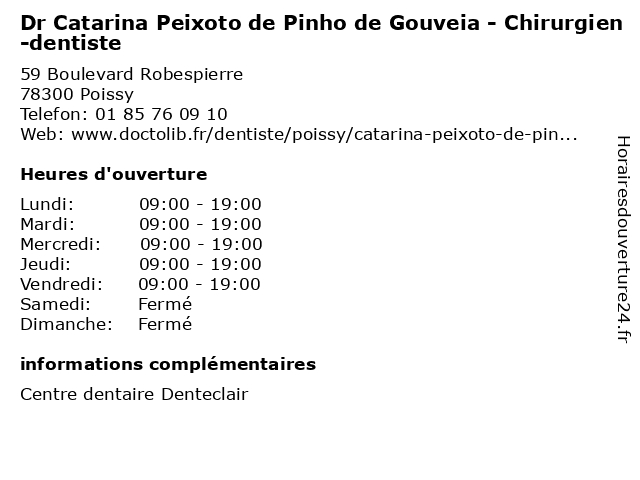 1 Dr Ana Catarina Rodrigues Veloso - Chirurgien-dentiste (Distance: 8,30 km) 90 Avenue Maurice Berteaux, 78500 Sartrouville ana, catarina, chirurgien, dentaire, dentiste, dr, implantologie, parodontologie, rodrigues, veloso 2 Dr Catarina Simoes - Chirurgien-dentiste (Distance: 13,03 km) 1 Place du Général de Gaulle, 95300 Pontoise catarina, centre, chirurgien, couronne, dentaire, dentiste, dr, gouttière, implant, panoramique, pontoise, prothèse, radio, simoes 3 Dr Catarina Rocha - Chirurgien-dentiste (Distance: 13,22 km) 27 Avenue de la Constellation, 95800 Cergy catarina, chirurgien, dent, dentiste, docteur, dr, rocha, soins 4 Dr Catarina Silva - Chirurgien-dentiste (Distance: 15,01 km) 19 Rue Saint-Denis, 92700 Colombes catarina, chirurgien, dent, dentiste, docteur, dr, silva, soins 5 Dr Ana Catarina Rodrigues-Veloso - Chirurgien-dentiste (Distance: 15,84 km) 163 Avenue Charles de Gaulle, 92200 Neuilly-sur-Seine ana, catarina, chirurgie, chirurgien, dentaire, dentiste, dr, rodrigues, veloso 6 Dr Catarina Gomes Espinha - Chirurgien-dentiste (Distance: 17,66 km) 15 Rue Pierre Brossolette, 92600 Asnières-sur-Seine asnières, catarina, centre, chirurgien, dentaire, dentiste, dr, espinha, gomes, implantologie, mairie, parodontologie |