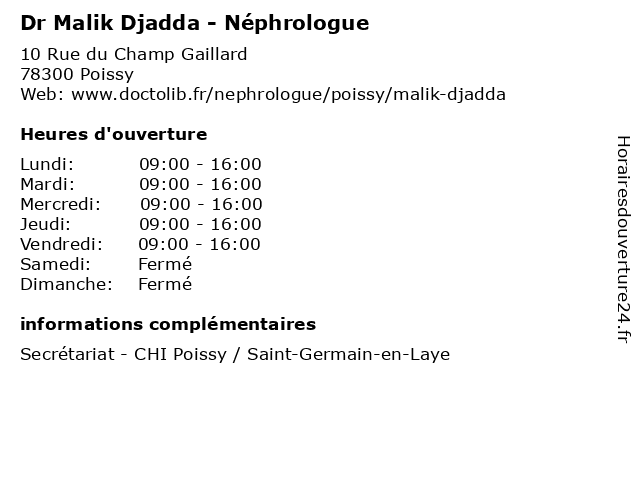 1 Dr Anthony Corchia - Néphrologue (Distance: 0,00 km) 10 Rue Du Champ Gaillard, 78300 Poissy anthony, consultation, corchia, docteur, dr, med, médecin, néphrologue, traitement 2 Medecin Philippe Hiernaux (néphrologue) (Distance: 13,40 km) 21 Rue de Sartrouville, 95870 Bezons docteur, hiernaux, medecin, néphrologue, philippe, sante, services 3 Dr Aldjia Hocine - Néphrologue (Distance: 15,68 km) 178 Rue des Renouillers, 92700 Colombes aldjia, docteur, dr, hocine, médecin, néphrologie, néphrologue 4 Dr Liliane Ngango Nga Messi - Néphrologue (Distance: 15,80 km) 14 Rue Castiglione del Lago,, 78190 Trappes dr, liliane, messi, médecins, médicaments, nga, ngango, néphrologue, santé, secrétariat, spécialiste 5 Dr Geoffroy Desbuissons - Néphrologue (Distance: 15,80 km) 14 Rue Castiglione del Lago, 78190 Trappes consultation, desbuissons, docteur, dr, geoffroy, med, médecin, néphrologue, traitement 6 Dr Malik Siaci - Chirurgien-dentiste (Distance: 15,86 km) 36 Boulevard Henri Sellier, 92150 Suresnes chirurgien, dentiste, dr, malik, médecin, médecine, médical, pharmaceutique, siaci, traitement |