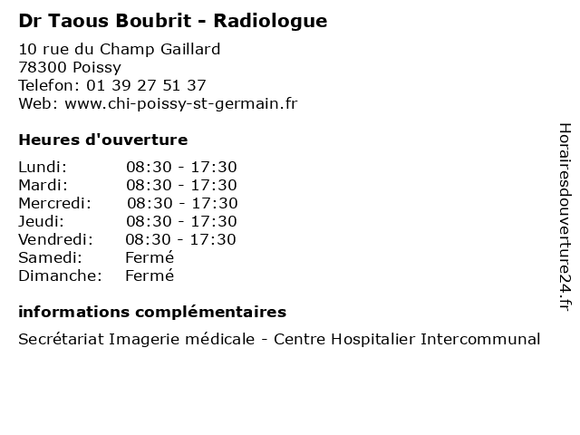 Termes de recherche pour Dr Taous Boubrit - Radiologue:en, poissy, germain, laye, radiologie, ch, imagerie, dr, intercommunal, diagnostique, thérapeutique, radiologue, taous, boubrit, poissy/saint |