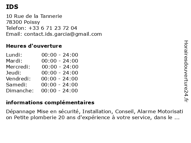 1 IDS Electricité (Distance: 19,07 km) 65 Avenue Pierre Grenier, 92100 Boulogne-Billancourt depannage, electricité, ids, réparation, services, électricien, électricité 2 Importation Distribution Services è IDS (Distance: 19,79 km) 23 rue Boissière, 75016 Paris biométrie, communication, distribution, i.d.s., ids, importacion, importation, informatique, service, services, téléphonie 4 1001Pharmacies / Société IDS Santé (Distance: 42,27 km) 1a Rue André, 60500 Chantilly 1001pharmacies, ids, la médecine, la pharmacie, la santé, les soins, pharmacie, santé, société |