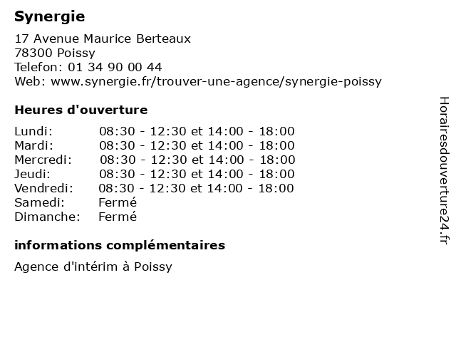 1 Synergie (Distance: 5,65 km) 32 Rue du Vieil Abreuvoir, 78100 Saint Germain en Laye agence, emploi, intérim, synergie 2 Synergie (Distance: 16,00 km) 5 place Charras, 92400 Courbevoie agence, intérim, offres d'emploi, synergie, synergy, toutes les offres d'emploi 3 Synergie (Distance: 16,23 km) 25 Rue des Etats Généraux, 78000 Versailles agence, emploi, intérim, synergie 4 Synergie (Distance: 19,82 km) 4 avenue Laurent Cely, 92600 Asnières agence, emploi, intérim, services, synergie 5 Synergie Proxi (Distance: 1,40 km) 45 Rue Jean-Pierre Timbaud, 78300 Poissy agence, emploi, intérim, proxi, synergie 6 Bio synergie (Distance: 14,24 km) 40 rue Gabriel Péri, 78210 Saint cyr l'ecole analyse par rayons x, bio, détection, examenenes de laboratoire, synergie |