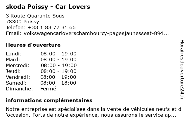 1 skoda Poissy - Car Lovers (Distance: 0,02 km) 3 Route de Quarante Sous, 78300 Poissy car, lovers, poissy, skoda 2 Dacia Chambourcy - CAR LOVERS (Distance: 0,29 km) 100 Avenue de la Renaissance, 78240 Chambourcy car, chambourcy, dacia, lovers 3 Volkswagen Occasions Orgeval - CAR LOVERS (Distance: 3,24 km) 1067 Route de Quarante Sous, 78630 Orgeval car, lovers, occasions, orgeval, volkswagen 4 Renault Vernouillet - Car Lovers (Distance: 7,17 km) 41 Boulevard de l'Europe, 78540 Vernouillet car, lovers, renault, vernouillet 5 Renault Minute Car Lovers (Distance: 9,33 km) 119 Avenue du Maréchal Foch, 78400 Chatou car, lovers, minute, renault 6 Renault Garage Résidence Car Lovers (Distance: 9,55 km) 17 Boulevard Fernand Hostachy, 78290 Croissy car, garage, lovers, renault, résidence |