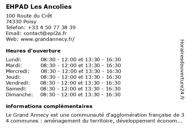 3 EHPAD La résidence heureuse (Distance: 4,38 km) 4 Rue Geneviève de Gaulle-Anthonioz, 74000 Annecy ehpad, heureuse, la, résidence 5 EMERA - EHPAD Le Pré Fornet (Distance: 4,92 km) 1 Route des Blanches, 74600 Seynod ehpad, emera, fornet, le, pré 6 |