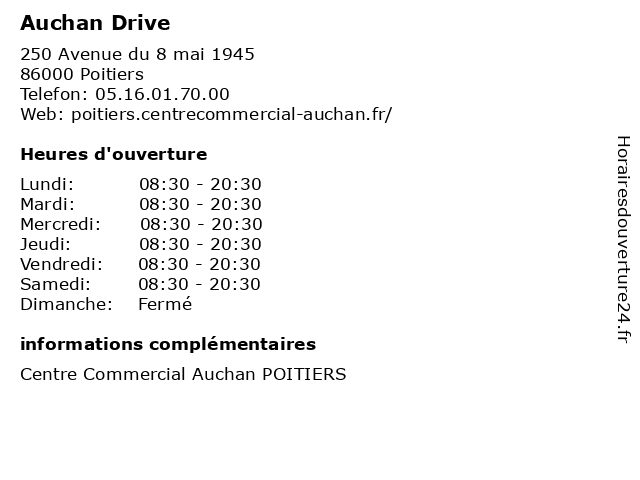 1 Auchan Drive (Distance: 1,57 km) . Route de la saulaie, 86240 Croutelle auchan, drive, hypermarche, marche, market 2 Auchan Services (Distance: nan km) 250 Avenue du 8 mai 1945, 86000 Poitiers auchan, beaute, boutiques, brasserie, cache, chaussures, concorde, deco, enfants, le, mode femme, mode hommes, optique, restaurant, services, sport 3 Auchan (Distance: 0,53 km) 250 Avenue du 8 Mai 1945, 86000 Poitiers accessories, auchan, cafe, chaussures, hauts, lingerie, mode femme, restaurants, robe 4 Auchan Poitiers Sud (Distance: 0,53 km) 250 Avenue du 8 mai 1945, 86000 POITIERS auchan, poitiers, sud 5 Asie Xpress Asie Xpress Auchan (Distance: 5,09 km) 23 Route De Parthenay, 86000 Poitiers asie, auchan, restaurants, xpress 6 Auchan Carburant (Distance: 13,27 km) Centre Commercial, 86360 Chasseneuil Du Poitou auchan, carburant, essence, service, stations |