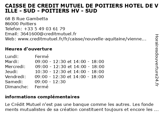 Termes de recherche pour CAISSE DE CREDIT MUTUEL DE POITIERS HOTEL DE VILLE - SUD - POITIERS HV - SUD:de, ville, poitiers, hôtel, crédit, sud, mutuel, caisse, hv |