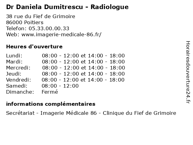 1 Dr Daniela Dumitrescu - Radiologue (Distance: 2,09 km) 1 Rue de la Providence, 86000 Poitiers daniela, diagnostique, dr, dumitrescu, imagerie, radiologie, radiologue, thérapeutique 2 Dr Daniela Dumitrescu - Radiologue (Distance: 4,33 km) 3 Rue Eugene Chevreul, 86000 Poitiers daniela, diagnostique, dr, dumitrescu, imagerie, radiologie, radiologue, thérapeutique 3 Dr Daniela Gheorghiu - Radiologue (Distance: 4,30 km) 3 Rue Eugene Chevreul, 86000 Poitiers consultation, daniela, docteur, dr, gheorghiu, med, médecin, radiologue, traitement 4 Dr Olivier Azaïs - Radiologue (Distance: 0,00 km) 38 rue du Fief de Grimoire, 86000 Poitiers azaïs, consultation, docteur, dr, med, médecin, médecine, olivier, radiologue, traitement 5 Dr Jean-Michel Charonnet - Radiologue (Distance: 0,00 km) 38 rue du Fief de Grimoire, 86000 Poitiers charonnet, consultation, docteur, dr, jean, med, michel, médecin, médecine, radiologue, traitement 6 Dr Yves David - Radiologue (Distance: 0,00 km) 38 rue du Fief de Grimoire, 86000 Poitiers consultation, david, docteur, dr, med, médecin, médecine, radiologue, traitement, yves |