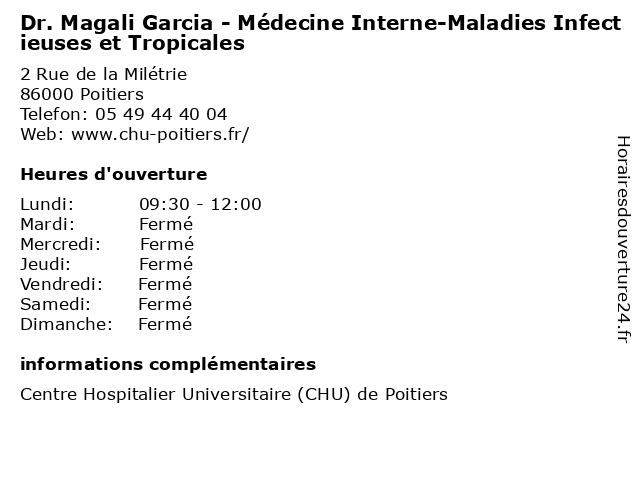 1 Dr. Eva Feigerlova -Médecine Interne-Endocrinologie et Maladies Métaboliques (Distance: 0,00 km) 2 Rue de la Milétrie, 86000 Poitiers docteur, dr., endocrinologie, et, eva, feigerlova, interne, maladies, medecins, médecine, métaboliques, sante 2 Pr. Richard Marechaud - Médecine Interne-Endocrinologie et Maladies Métaboliques (Distance: 0,00 km) 2 Rue de la Milétrie, 86000 Poitiers docteur, endocrinologie, et, interne, maladies, marechaud, medecins, médecine, métaboliques, pr., richard, sante 3 Dr. Marine Grosset - Médecine Interne-Maladies Infectieuses et Tropicales (Distance: 0,00 km) 2 Rue de la Milétrie, 86000 Poitiers docteur, dr., et, grosset, infectieuses, interne, maladies, marine, medecins, médecine, sante, tropicales 4 Dr. Marie Pathe - Médecine Interne-Maladies Infectieuses et Tropicales (Distance: 0,00 km) 2 Rue de la Milétrie, 86000 Poitiers docteur, dr., et, infectieuses, interne, maladies, marie, medecins, médecine, pathe, sante, tropicales 5 Dr. Blandine Rammaert - Médecine Interne- Maladies Infectieuses et Tropicales (Distance: 0,00 km) 2 Rue de la Milétrie, 86000 Poitiers blandine, docteur, dr., et, infectieuses, interne, maladies, medecins, médecine, rammaert, sante, tropicales 6 CHU Jean Bernard - Médecine interne (secrétariat) (Distance: 0,00 km) 2 rue de la milétrie, 86021 Poitiers bernard, chu, consultation, docteur, interne, jean, médecine, santé, secrétariat |