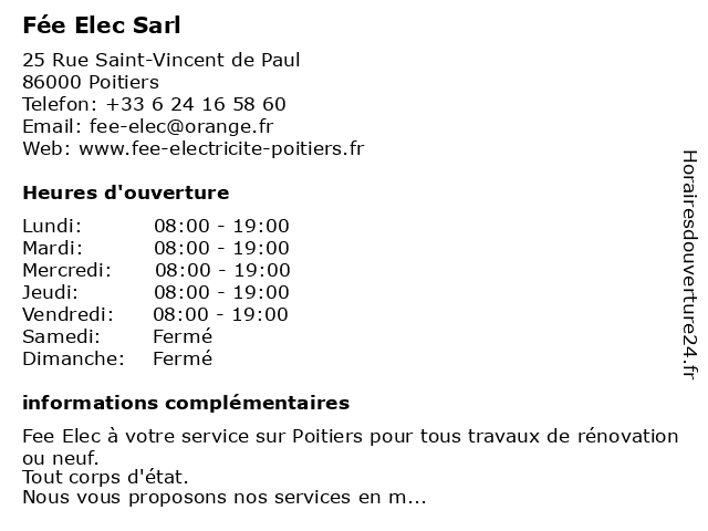 1 La Fée maraboutée (Distance: 0,47 km) 17 rue Régratterie, 86000 Poitiers accessoires pour femmes, fée, la, maraboutée, prêt à porter, vêtements 6 Pur'Elec (Distance: 17,95 km) 7 Rue Prunus, 86470 La Chapelle Montreuil dépannage, pur'elec, réseau, électricité |