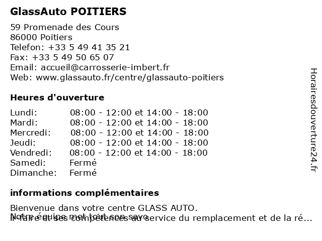 1 GlassAuto FONTAINE LE COMTE (Distance: 7,17 km) 3 Allée des Cerfs, 86240 Fontaine-le-Comte changement pare-brise, changement vitrage, comte, fontaine, garage automobile, glassauto, le, optiques de phare, remplacement pare-brise, remplacement vitrage, réparation pare-brise, réparation vitrage, rétroviseurs, toit ouvrant 2 Carglass (Distance: 1,37 km) 6-8 Boulevard Maréchal de Lattre de Tassigny, 86000 Poitiers bris, carglass, pare-brise, remplacement 3 Planete Pare-Brise (Distance: 2,24 km) 62bis Avenue du 8 Mai 1945, 86000 Poitiers bris, brise, pare, pare-brise, planete, remplacement, vitre 4 Feu Vert (Distance: 2,46 km) 2 Avenue de Lafayette, 86000 Poitiers amortisseurs, ampoule, autoradio, batterie, chaussettes neige, chaînes neige, coffre de toit, feu, freinage, glacière, pneu, pneu 4 saisons, pneu hiver, remorque, révision, vert, vidange 5 Asturienne (Distance: 3,13 km) 14 Rue de la demi lune, 86000 Poitiers asturienne, fenêtres, fumisterie, outillage, panneaux, toit 6 G Vitrage (Distance: 3,80 km) 246 Avenue du 08 Mai 1945, 86000 Poitiers fourniture et pose, miroiterie, réparation, verrerie, verres spéciaux, vienne, vitrage |