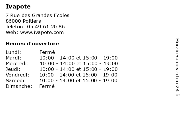 | Vendredi | 10:00-14:00 et 15:00-19:00 |