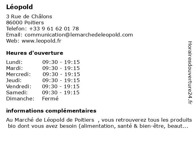 3 Le Marché de Léopold - Poitiers Est (Distance: 0,13 km) 22 Rue de Bignoux, 86000 Poitiers de, est, le, les comptoirs de la bio, léopold, magasin bio, magasin bio 86000, magasin bio poitiers, marché, poitiers 4 Le Marché de Léopold - St Benoit (Distance: 2,19 km) 50 Avenue du 11 Novembre, 86280 Saint-Benoît benoit, de, le, les comptoirs de la bio, léopold, magasin bio, magasin bio 86280, magasin bio saint-benoît, marché, st 5 Le Marché de Léopold - Poitiers Centre (Distance: 2,20 km) 20-22 Rue de Magenta, 86000 Poitiers centre, de, le, les comptoirs de la bio, léopold, magasin bio, magasin bio 86000, magasin bio poitiers, marché, poitiers 6 Le Marché de Léopold Poitiers Biard (Distance: 4,17 km) 8 Rue Annet Segeron, 86580 Biard biard, de, le, léopold, marché, poitiers |