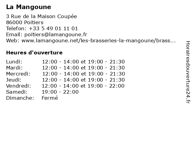 | Mardi | 12:00-14:00 et 19:00-21:30 |