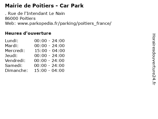 1 Mairie de Poitiers - Car Park (Distance: 0,00 km) . Rue de l'Intendant Le Nain, 86000 Poitiers automobile, car, de, mairie, park, parking, poitiers, services 2 Mairie de Poitiers - Car Park (Distance: 0,23 km) . Rue Grignon de Montfort, 86000 Poitiers automobile, car, de, mairie, park, parking, poitiers, services 3 Mairie de Poitiers - Car Park (Distance: 0,39 km) . Boulevard du Grand Cerf, 86000 Poitiers automobile, car, de, mairie, park, parking, poitiers, services 4 Mairie de Poitiers - Car Park (Distance: 0,68 km) . Rue des Couronneries, 86000 Poitiers automobile, car, de, mairie, park, parking, poitiers, services 5 Mairie de Poitiers - Car Park (Distance: 0,71 km) 52 Boulevard du Grand Cerf, 86000 Poitiers automobile, car, de, mairie, park, parking, poitiers, services 6 Mairie de Poitiers - Car Park (Distance: 0,82 km) . Voie André Malraux, 86000 Poitiers automobile, car, de, mairie, park, parking, poitiers, services |