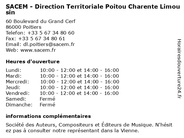 Termes de recherche pour SACEM - Direction Territoriale Poitou Charente Limousin:poitou, direction, limousin, charente, territoriale, sacem |