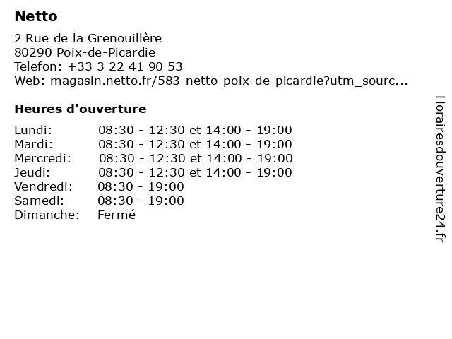 1 Netto Poix-de-Picardie (Distance: 0,10 km) 2 Rue de la Grenouillère, 80290 Poix-de-Picardie de, netto, picardie, poix 2 Netto Station Service (Distance: 1,36 km) - Route du Treport, 80290 Gauville carburant, essences, gazole, netto, service, services, station 5 Netto Station Service (Distance: 24,34 km) 495 Route d'Abbeville, 80000 Amiens carburant, essences, gazole, netto, service, services, station 6 Netto (Distance: 27,68 km) - Pierre, 80260 Flesselles achats de produits alimentaires, des prix bas, grands supermarchés, hard discount, netto, supermarchés |