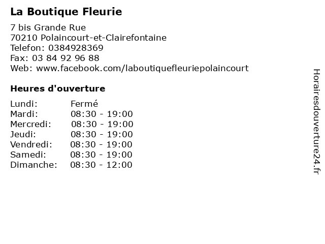 1 MA BOUTIQUE CADEAUX (Distance: 4,84 km) 31 Grande Rue, 70210 Vauvillers bijoux, boutique, boutique de cadeaux, cadeaux, carnet de notes, cuisine et vaiselle, décoration, jeux créatifs, jeux de sociétés, jouets, livres, livres pour enfant, ma 2 Artisans Fleuristes de France - La Boite A Fleurs (Distance: 21,62 km) 27 Rue Gilberte Lavaire, 70170 Port-sur-Saône artisans, boite, bouquets, de, fleuristes, fleurs, flowers, france, la, the funeral, wedding collection 3 Fleurs'T Nature (Distance: 24,76 km) 11 rue du bas de Laval, 70220 Fougerolles bouquet, composition, fleuriste, fleurs, fleurs't, nature 4 Aux Bouquets Champêtres (Distance: 29,73 km) 11 place Pierre Renet, 70000 Vesoul aux, bouquets, champetres, champêtres, fleur, fleuriste 5 Le Lys Blanc (Distance: 41,36 km) 27 Rue de la Xavée, 88200 Remiremont blanc, bouquets, composition, fleuriste, fleurs, floral, le, lys, plantes 6 Artisans Fleuristes de France - Maite Fleurs (Distance: 42,95 km) 5 Rue de Remiremont, 88380 Arches artisans, bouquets, de, fleuristes, fleurs, flowers, france, maite, the funeral, wedding collection |