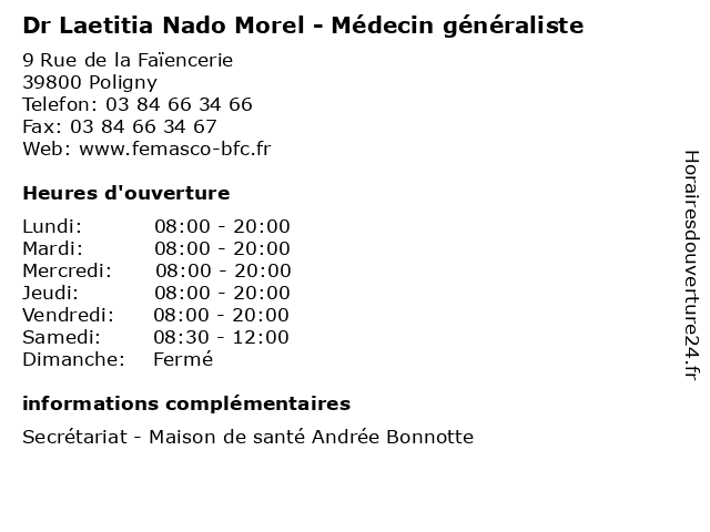 1 Dr Loïc Nado - Médecin généraliste (Distance: 0,00 km) 9 Rue de la Faïencerie, 39800 Poligny consultation, docteur, dr, généraliste, loïc, med, médecin, médecine, nado, traitement 2 Les Pieds sur Terre - Domaine Morel (Distance: 0,21 km) 8 Rue Jacques Coittier, 39800 Poligny cave, domaine, les, morel, pieds, sur, terre, valentin morel, vins 3 École élémentaire publique Aragon Morel (Distance: 9,50 km) 1 Rue Château Pecauld, 39600 Arbois aragon, cours, education, morel, publique, services, école, élémentaire 4 Gauthier Laetitia (Distance: 17,73 km) 42 Rue de la Liberté, 39110 Salins-les-Bains gauthier, laetitia 5 Sonance Audition Morel (Distance: 18,20 km) 45 Avenue de la République, 39300 Champagnole audition, morel, sonance 6 Pernin Laetitia (Distance: 18,83 km) 1 Rue De l Etang, 39600 Villers Farlay laetitia, pernin, restaurants |