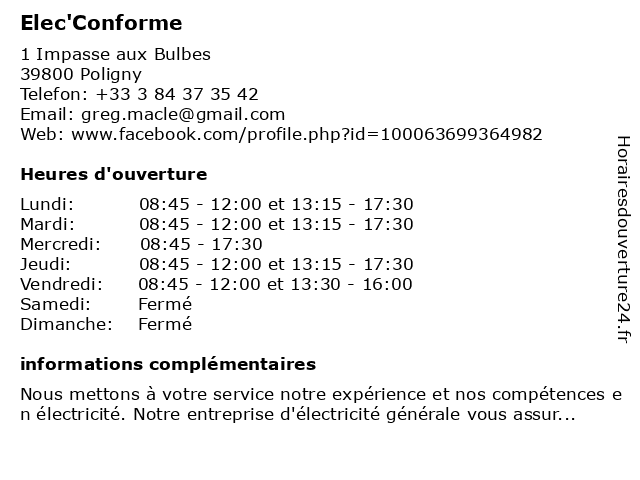 | Jeudi | 08:45-12:00 et 13:15-17:30 |