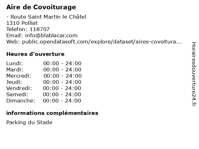 1 Aire de Covoiturage (Distance: 0,45 km) - Route de chamonin, 01310 Polliat aire, covoiturage, de, partager, trajets 2 Aire de Covoiturage (Distance: 5,09 km) - Mairie, 01340 Attignat aire, covoiturage, de, partager, trajets 3 Aire de Covoiturage (Distance: 9,61 km) - Place General de gaulle, 01340 Montrevel aire, covoiturage, de, partager, trajets 4 Aire de Covoiturage (Distance: 11,03 km) - Place de L'Eglise, 01340 Marsonnas aire, covoiturage, de, partager, trajets 5 Aire de Covoiturage (Distance: 11,76 km) - D1083 - Parking des Sports, 01960 Servas aire, aires, covoiturage, de, partager, trajets 6 Aire de Covoiturage (Distance: 13,10 km) - Chemin des Lyonnières, 01370 Saint Etienne-Du-Bois aire, covoiturage, de, partager, trajets |