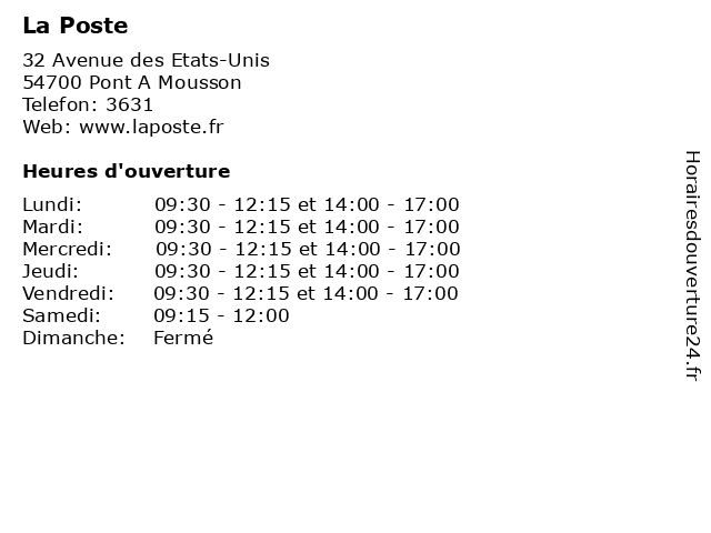 1 La Poste (Distance: 0,55 km) 59 Rue 26e Btn De Chasseurs A Pieds, 54700 Pont A Mousson express chronopost, la, poste, réexpédition internationale 4 La Poste (Distance: 5,29 km) 28 Rue Charles de Gaulle, 54121 Vandieres express chronopost, la, poste, réexpédition internationale 5 La Poste (Distance: 10,16 km) - Rue de la Mairie, 54940 Belleville express chronopost, la, poste, réexpédition internationale 6 La Poste (Distance: 11,91 km) - Le Bourg, 54530 Arnaville agence, assurance, banque, banque postale, bureau de poste, chronopost, colis, courrier, dps, expéditions internationales, la, point, postale, poste, relais, timbres, téléphonie, ups, western union |