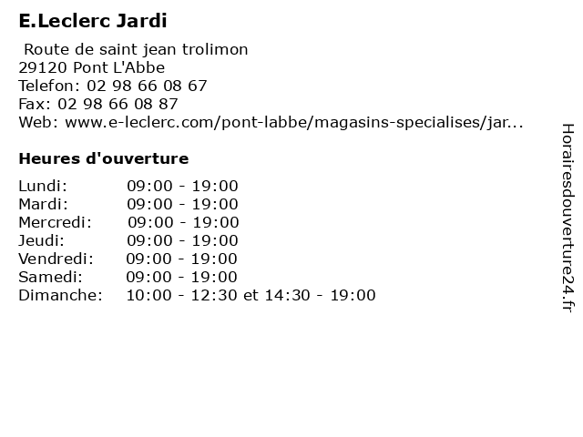 1 E.Leclerc Nos Animaux (Distance: 0,01 km) Route de saint jean trolimon, 29120 Pont L'Abbe animaux, e.leclerc, fournisseur de clôtures pour animaux domestiques, magasin d'aquariums, magasin pour animaux de compagnie, nos, toiletteur 2 E.Leclerc Parapharmacie (Distance: 0,10 km) Route de saint jean trolimon, 29120 Pont L'Abbe e.leclerc, magasin de produits de soins capillaires, parapharmacie 3 E.Leclerc Pont L'Abbe (Distance: 0,11 km) Route de saint jean trolimon, 29120 Pont L'Abbe e.leclerc, l'abbe, pont, supermarchés 4 E.Leclerc Animalerie (Distance: 0,33 km) - Route de Saint-Jean Trolimon, 29120 Pont-l'Abbé animalerie, e.leclerc, leclerc 5 E.Leclerc Station Service (Distance: 0,80 km) Za de kerganet, 29720 Plonéour-Lanvern e.leclerc, fournisseur de gaz, fournisseur de gaz propane, service, station 6 E.Leclerc Espace culturel (Distance: 15,82 km) . De Salaun, 29170 Pleuven culturel, e.leclerc, espace, service, services, services a la personne |