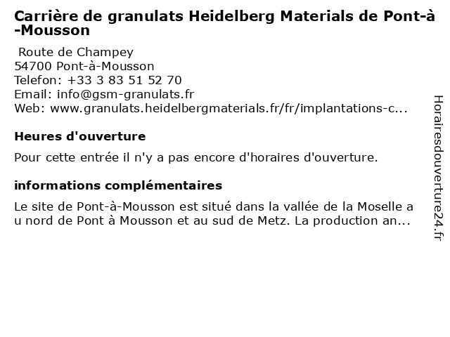 1 Centrale à béton Heidelberg Materials de Pont-à-Mousson (Distance: 0,02 km) Route de Champey, 54700 Pont-à-Mousson béton, centrale, de, heidelberg, materials, mousson, pont 3 Granulats Vicat Blénod-lès-Pont-à-Mousson (Distance: 5,15 km) Rue du Fort des Romains, 54700 Blénod-lès-Pont-à-Mousson blénod, granulats, lès, mousson, pont, vicat 4 Centrale à béton Heidelberg Materials de Moulin-lès-Metz (Distance: 18,65 km) Route d'Ars, 57160 Moulins-lès-Metz béton, centrale, de, heidelberg, lès, materials, metz, moulin 5 Carrière de granulats Heidelberg Materials de Pierre-la-Treiche (Distance: 33,84 km) L'Île aux Charmes, 54200 Chaudeney-sur-Moselle carrière, de, granulats, heidelberg, la, materials, pierre, treiche 6 Granulats Vicat Mare de Mancourt (Distance: 35,40 km) D55, 57365 Ennery de, granulats, mancourt, mare, vicat |