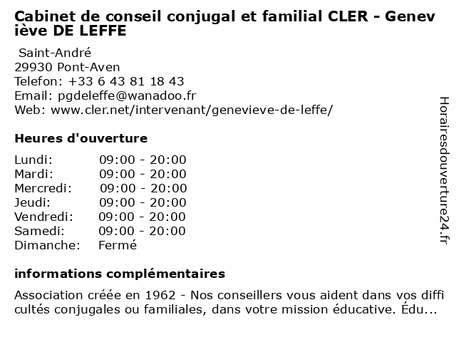 Termes de recherche pour Cabinet de conseil conjugal et familial CLER - Geneviève DE LEFFE:et, de, genevieve, cabinet, conseil, familial, leffe, cler, conjugal |
