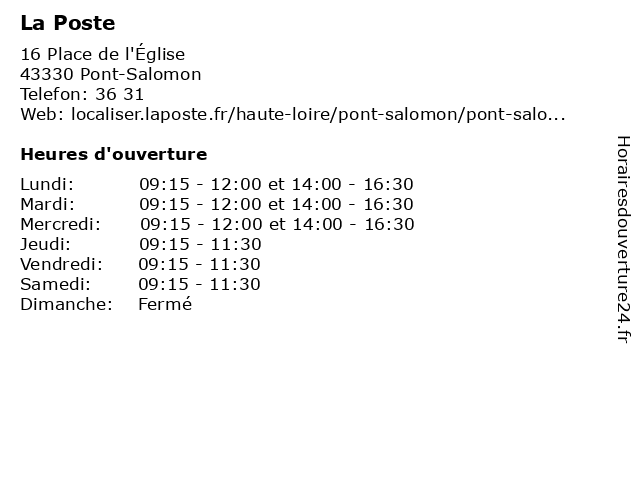 1 La Poste (Distance: 1,78 km) Route d'Auvergne, 43330 Saint-Ferréol-d'Auroure agence, assurance, banque, banque postale, bureau de poste, chronopost, colis, courrier, dps, expéditions internationales, la, point, postale, poste, relais, timbres, téléphonie, ups, western union 2 La Poste (Distance: 3,07 km) 22 Place Marcellin, 43120 La Chapelle-d'Aurec agence, colis, courriers, expédition, la, postale, poste, relais 3 La Poste (Distance: 5,02 km) 3 place de l'Église, 43140 La Seauve-sur-Semene agence, assurance, banque, banque postale, bureau de poste, chronopost, colis, courrier, dps, expéditions internationales, la, point, postale, poste, relais, timbres, téléphonie, ups, western union 4 La Poste (Distance: 5,39 km) 8 Place Moulin Prugnat, 43240 Saint-Just-Malmont agence, assurance, banque, banque postale, bureau de poste, chronopost, colis, courrier, dps, expéditions internationales, la, point, postale, poste, relais, timbres, téléphonie, ups, western union 5 La Poste (Distance: 7,24 km) - Place Mozarts, 42000 St Etienne electronic store, la, poste, services, store 6 La Poste (Distance: 11,16 km) - Au Bourg, 05250 St Etienne electronic store, la, poste, services, store |